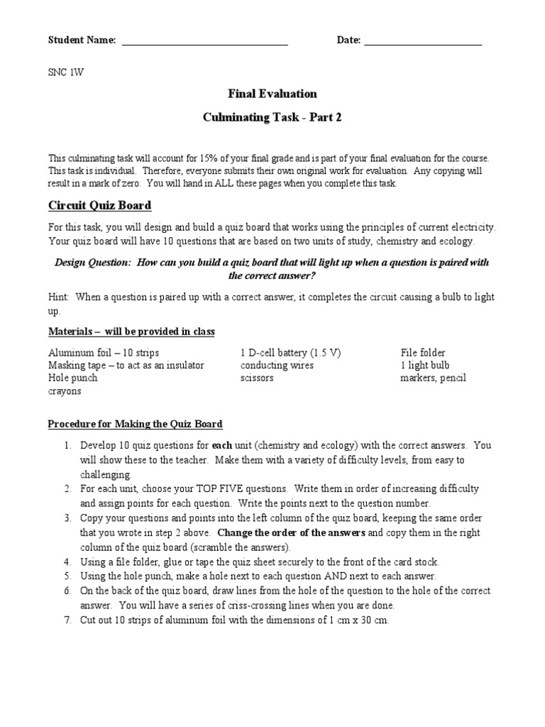 1W Culminating Task Circuit Quiz Board 2023 PDF Wire Electricity